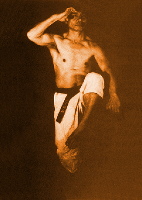 6. Reposer la jambe droite qui a frappé en avant en sanchin dachi droit puis frappe de la main gauche aux bas ventre d’un éventuel adversaire devant, et frappe de la main droite aux bas-ventre d’un éventuel adversaire derrière.