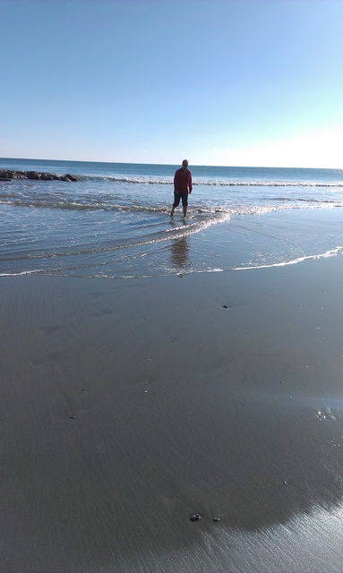 Lorsque j’y suis allé, dimanche 17 janvier 2016, il faisait très beau, mais le vent soufflait fort et était glacial. J’étais dans l’état d’esprit de celui qui sortait de chez lui après des semaines d’installation et qui voulait prendre un premier bain. Je savais l’eau froid, mais la météo des mers annoncait un petit 14° bien rigolo. 14° ça me fait pas peur, c’est à peine la température de l’océan atlantique en Bretagne lorsque j’allais m’y baigner en avril. Donc j’avais prévu ma serviette, et sous mon pantalon, un maillot de bain.